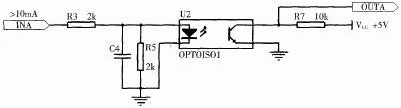 圖2為一路檢測脈沖輸入信號電路(另一路完全相同)。INA為輸入信號,是由光電傳感器采集到的閥門脈沖信號(>10mA)。該信號經(jīng)旁路電容濾波后送入光耦,轉(zhuǎn)換成了輸出的OUT電壓信號送入單片機(jī)。輸出的電壓可直接進(jìn)入單片機(jī)的I/O口。在控制中,要求A、B兩路脈沖都接收到的時(shí)候,才認(rèn)為是由信號輸入,AB為正轉(zhuǎn),BA為反轉(zhuǎn)。只有一路信號輸入時(shí)不計(jì)數(shù)。